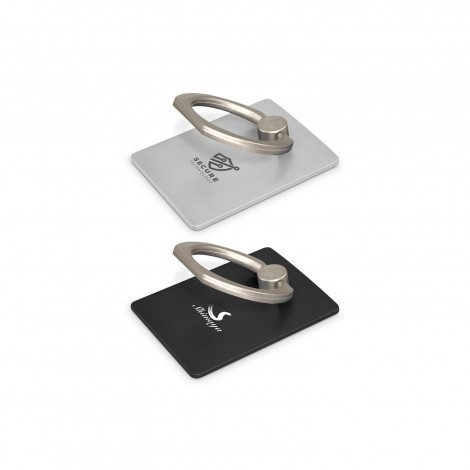 Low profile plastic phone grip which adheres securely to the back of a phone or phone case. It has a metal ring that snaps out to provide a secure finger grip or a handy phone stand.